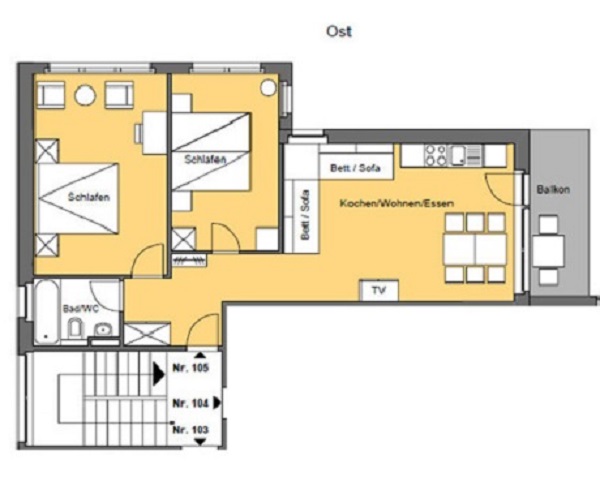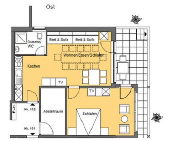 Beschrijving vakantiewoningen: Moderne en ruim ingerichte woningen. Alle met een balkon op het zuiden. In alle woningen is bedlinnen, hand, bad en keuken doeken aanwezig. In alle woningen is er een internet aansluiting. Wasmachine is in huis. Er kan voor u gewassen worden, na een gemaakte afspraak. Er zijn gratis parkeer plaatsen. STUDIO 2 personen 30m2 - Ruime woonkeuken met eethoek en zgn. klapbed voor 2 personen. - Moderne keuken met o.a. vaatwasser en 4 keramische kookplaten. - Douche en toilet. - Groot balkon op het zuiden met tafel en stoelen. - Event. kinderbed aanwezig. Studio 2 met extra comfort 42 m2 2 personen - Ruime woonkamer met eethoek en zitgroep. - Via houten trap naar slaapkamer met 2 persoonsbed. - Moderne keuken met vaatwasser en 4 keramische kookplaten. - Douche en toilet. - Ruim balkon op het zuiden met tafel en stoelen. - Event. kinderbed aanwezig. WONING A ♦ 2 kamerwoning. 2- 4 personen. 56m2 - Woonkamer met bank en eethoek. - Moderne keuken met koelkast, vaatwasser en 4 keramische kookplaten. - 1 Tweepersoons slaapkamer. - Badkamer met douche en toilet. - Groot balkon op het zuiden met tafel en stoelen. - Event. kinderbed beschikbaar. WONING B ♦ 3 kamerwoning. 4 personen. 65m2 - Woonkamer met 2 banken en eethoek. - Moderne keuken met vaatwasser, koelkast en 4 keramische kookplaten. - 1 Tweepersoons slaapkamer. - 1 Kamer met 2 eenpersoons bedden. - Badkamer met douche en toilet. - Groot balkon op het zuiden met tafel en stoelen. - Event. kinderbed beschikbaar. WONING C ♦ 3 kamerwoning. 4-6 personen. 75m2 - ruime woonkamer met bankstel en eethoek. - Moderne open keuken , vaatwasser en 4 keramische kookplaten. - 1 Tweepersoons slaapkamers. Event. 2 bedden in huiskamer. - 1 Slaapkamer met 2 eenpersoons bedden. - Badkamer met douche en toilet. - Balkon op het zuiden met tafels en stoelen. - Extra bed en/of kinderbed is mogelijk. Woning D ♦ 4 kamerwoning 6 personen event. 1 extra 105m2 - Ruime woonkamer met banstel en eethoek. - Moderne keuken met kookeiland, vaatwasser en 4 keramische kookplaten. - 2 Tweepersoons slaapkamers. - 1 Slaapkamer met 2 eenpersoons bedden. - Badkamer met douche en toilet. - 2 Balkons op het zuiden met leuk zitje. - Extra bed en/ of kinderbed mogelijk